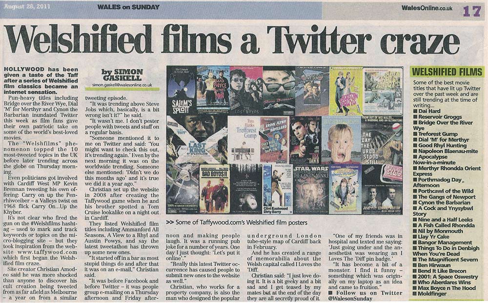 On 24/25 August 2011 #welshfilms trended worldwide on Twitter. As a result, Wales On Sunday ran this story with images from our gallery.